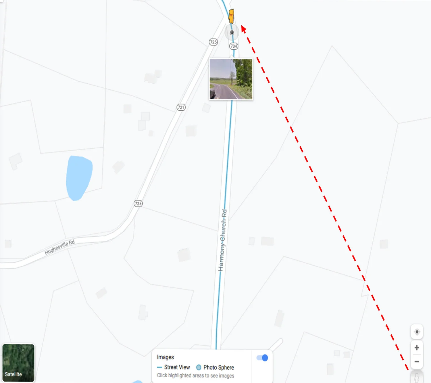 Even though the full road is not visible on Google street view, this tool still proves helpful by allowing us to simply inspect the entrance to this road to determine what the road looks like. In the image below, I’ve dropped my street view icon at the point where Hughesville road connects to a tarmac road called Harmony Church. With this view, we can now easily tell that Hughesville turns into a very neat gravel section. I mean, just look at that road! It’s inviting you to ride into that tree line and explore it!